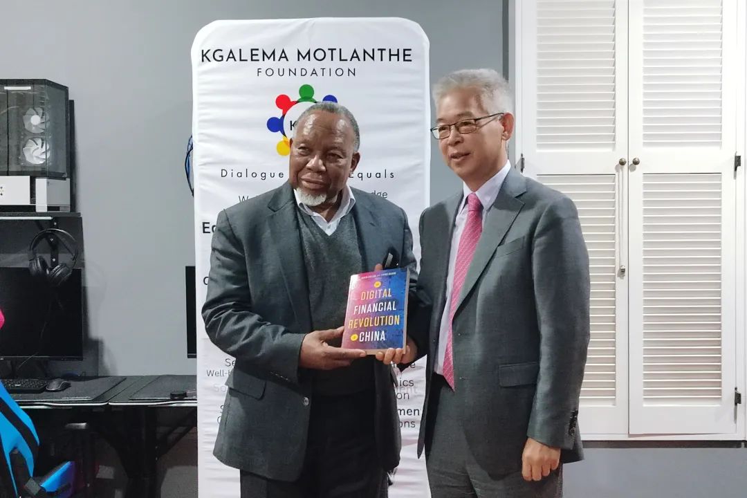 南非前总统卡莱马·莫特兰蒂接受黄益平教授赠书